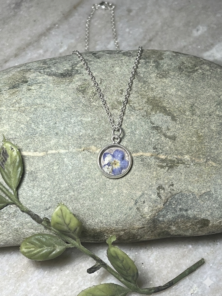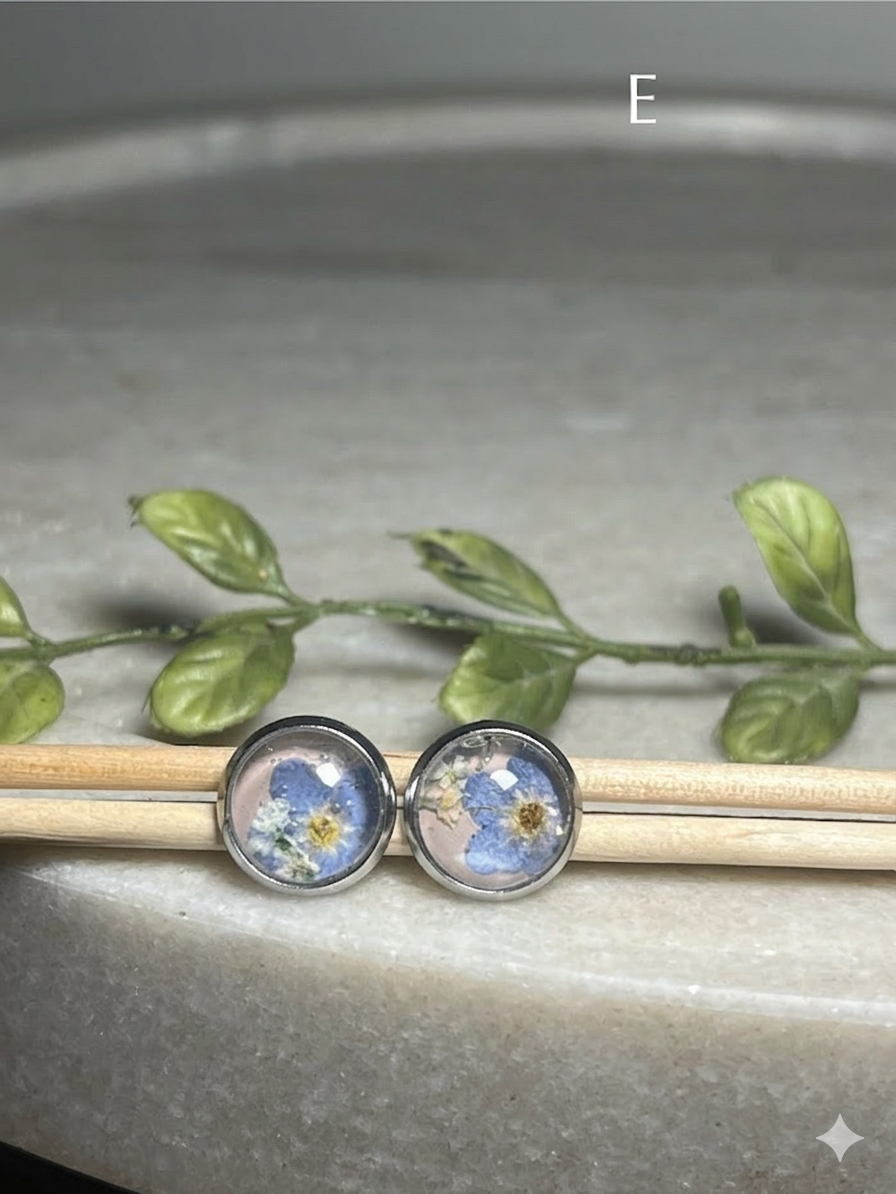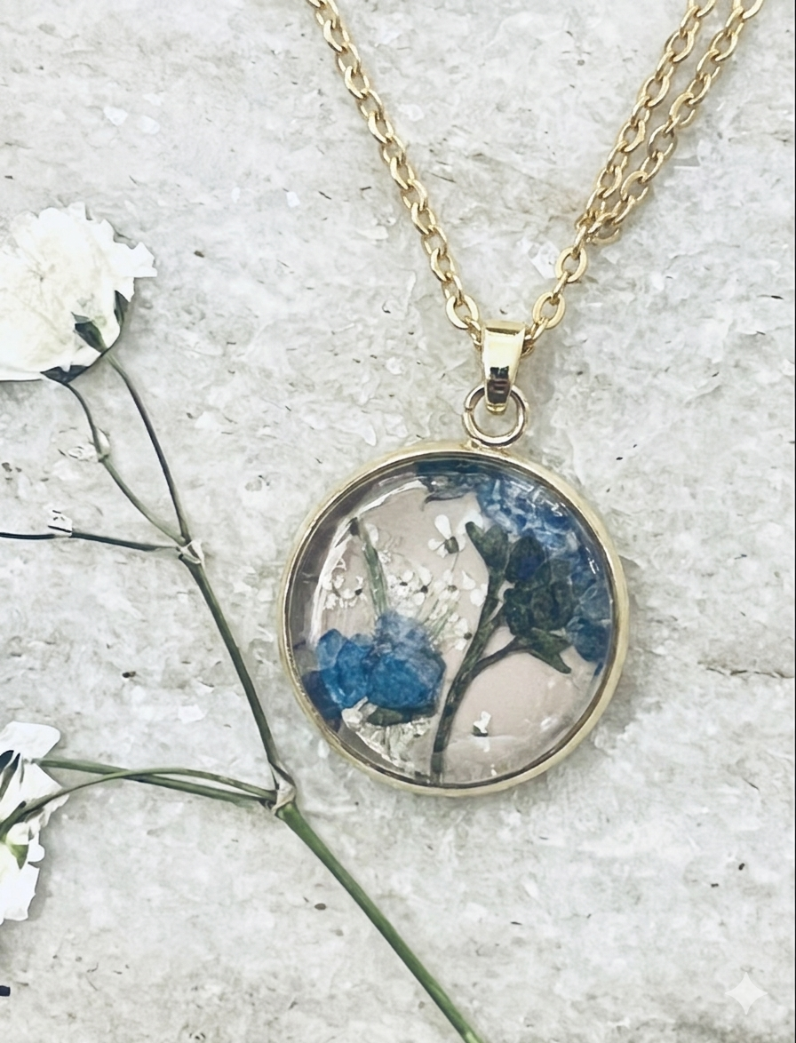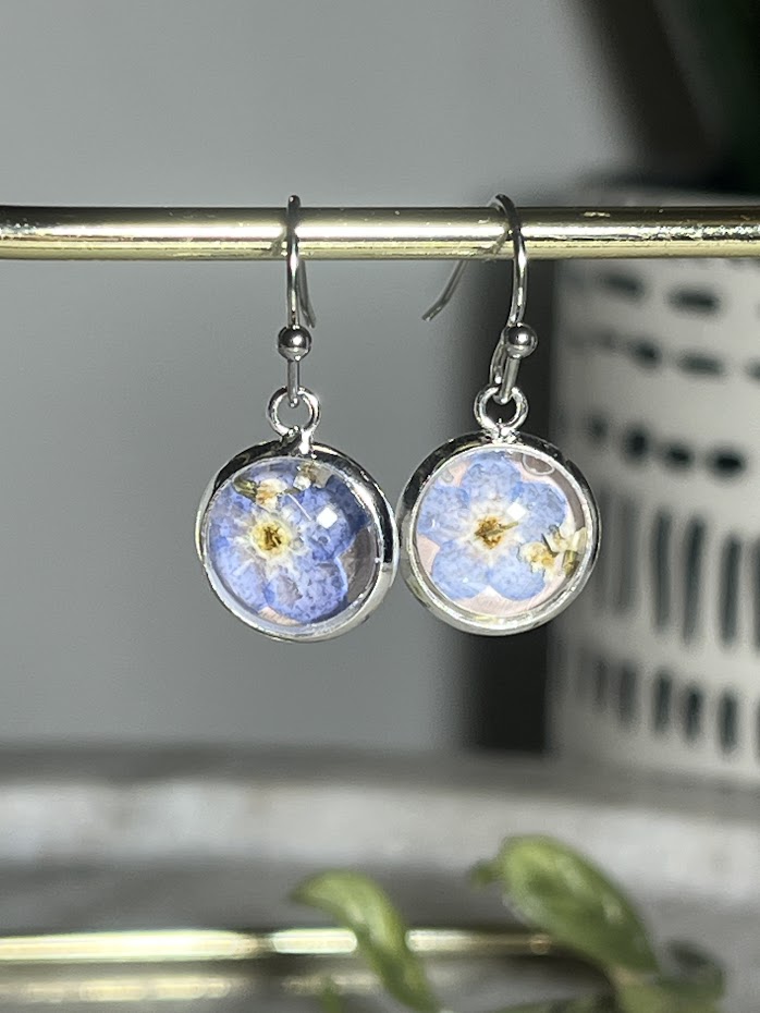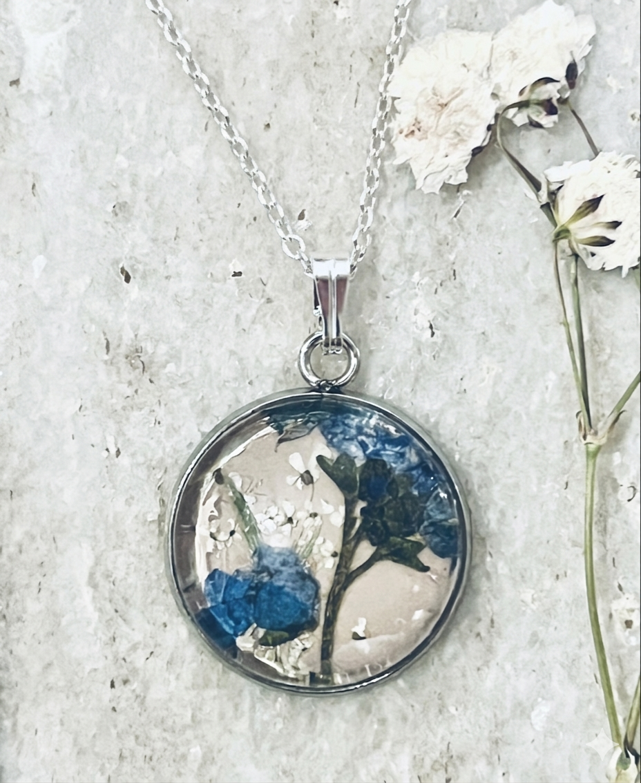 Forget me not bloom pressed on a blush background with white Queen Anne’s Lace accents