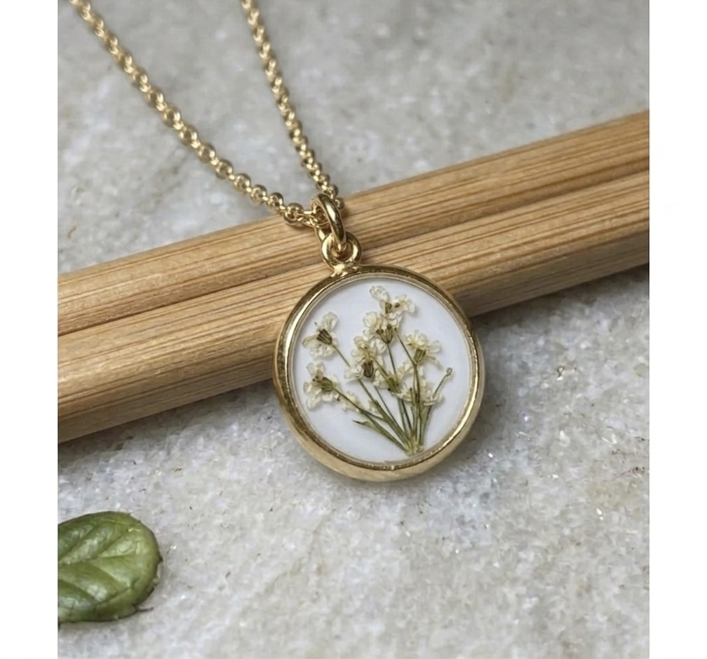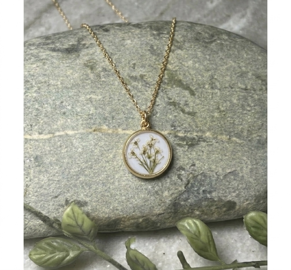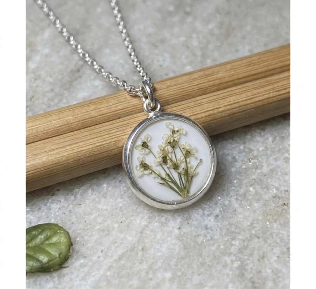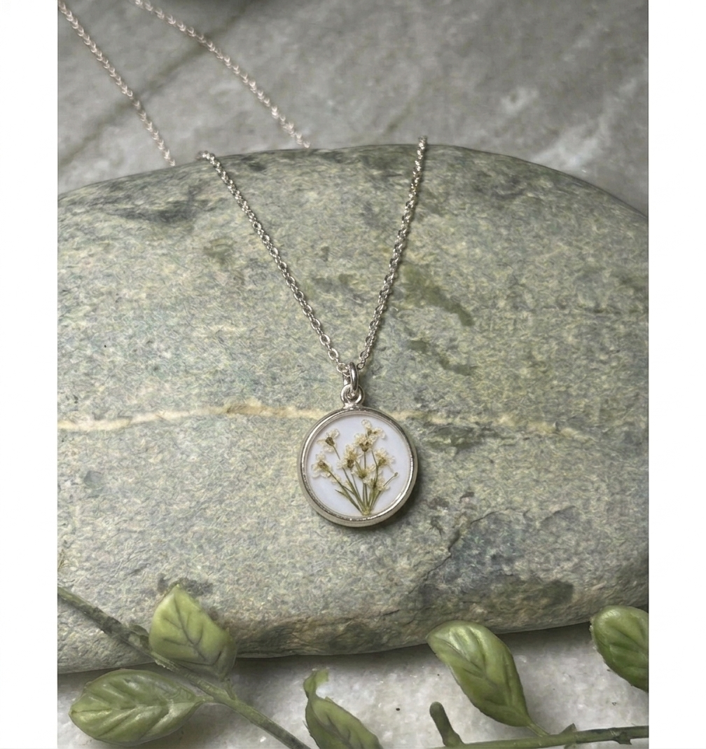 White Queen Anne’s Lace pressed blooms on a white background