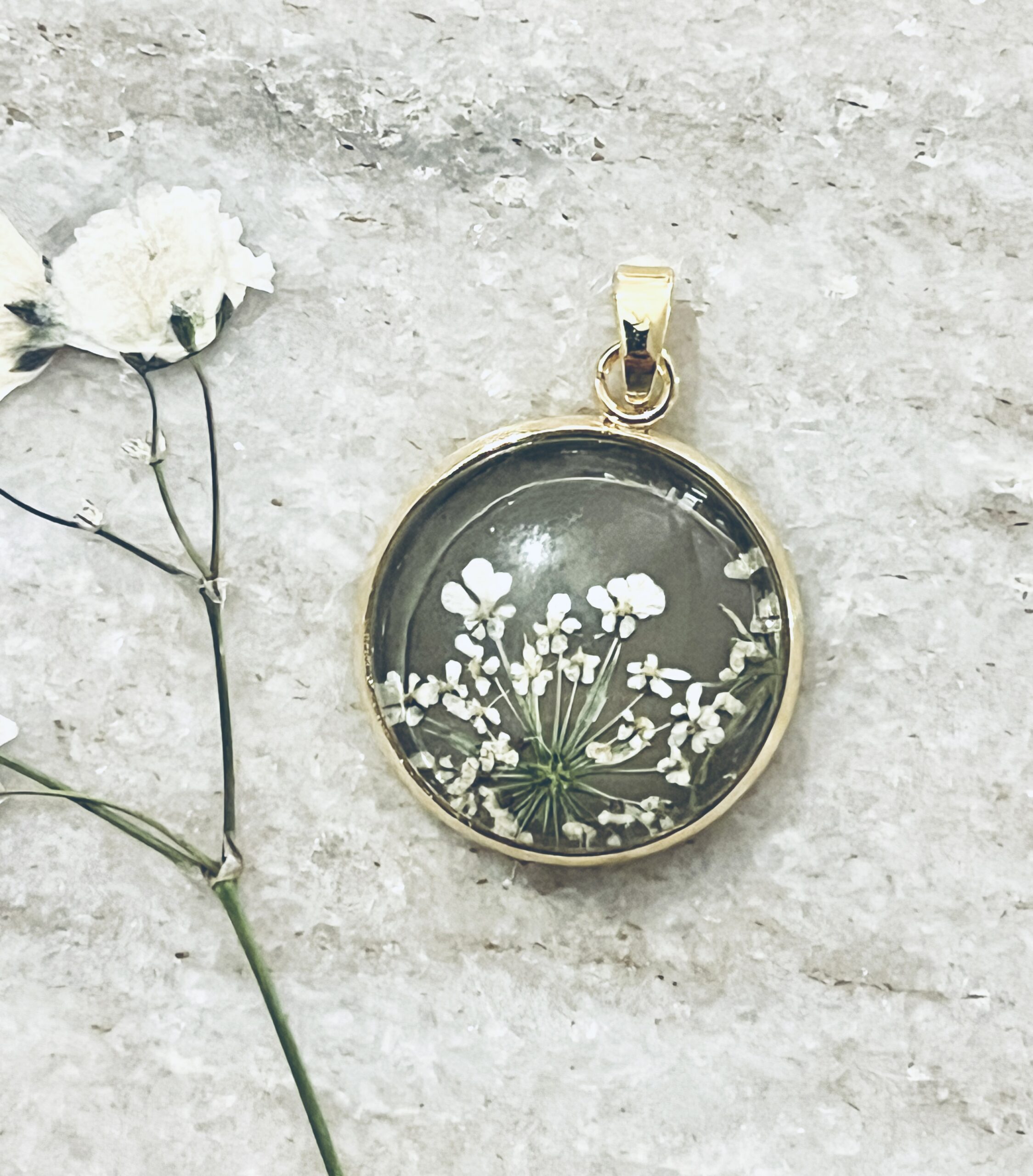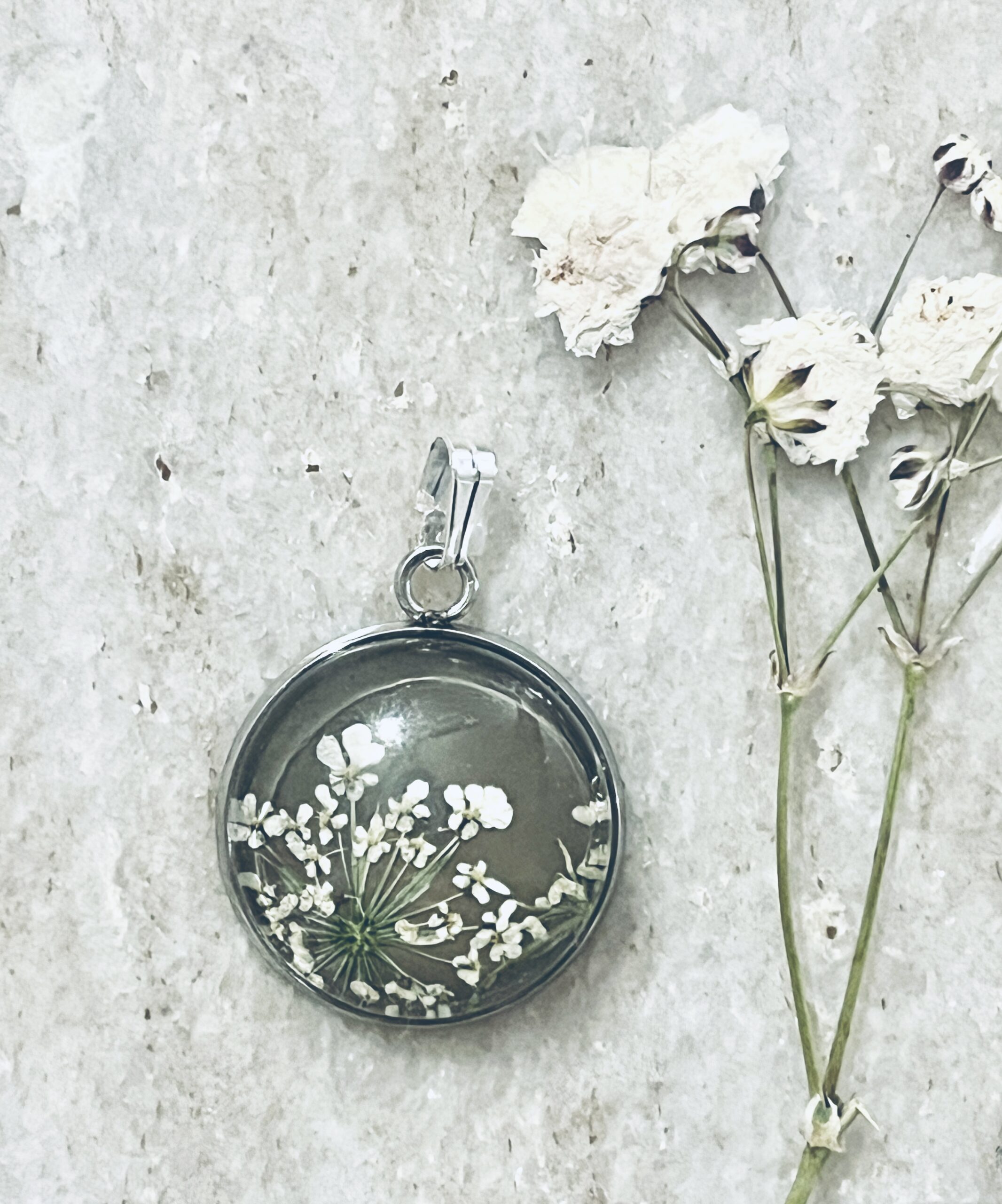 White Queen Anne’s Lace pressed blooms on a taupe background