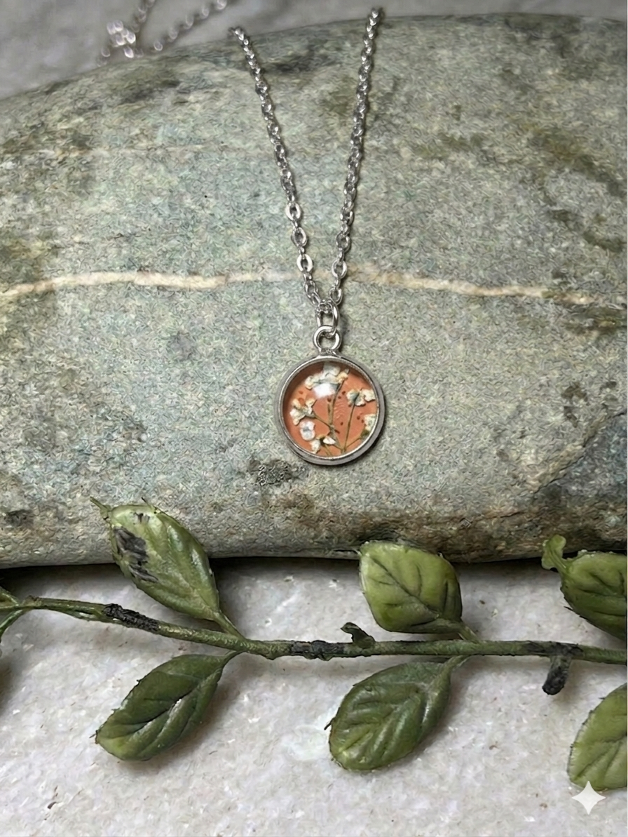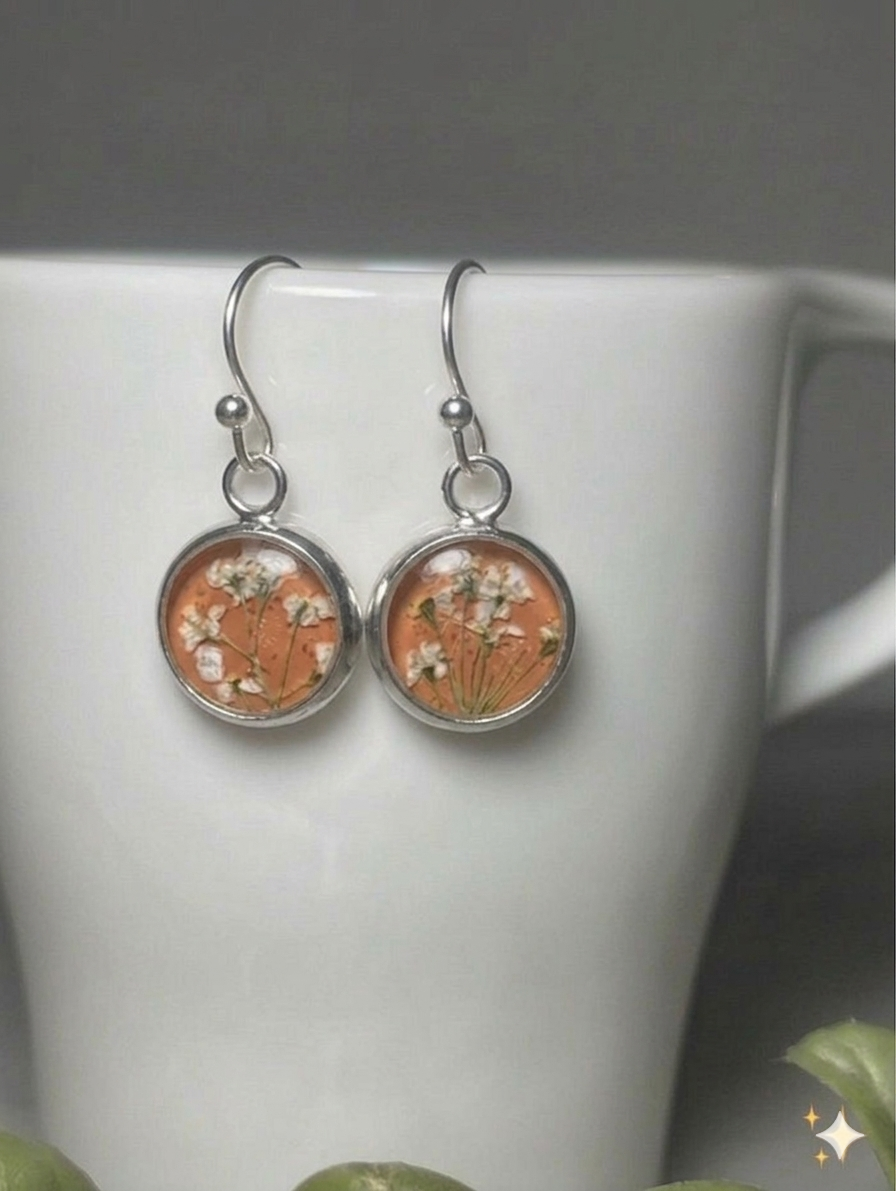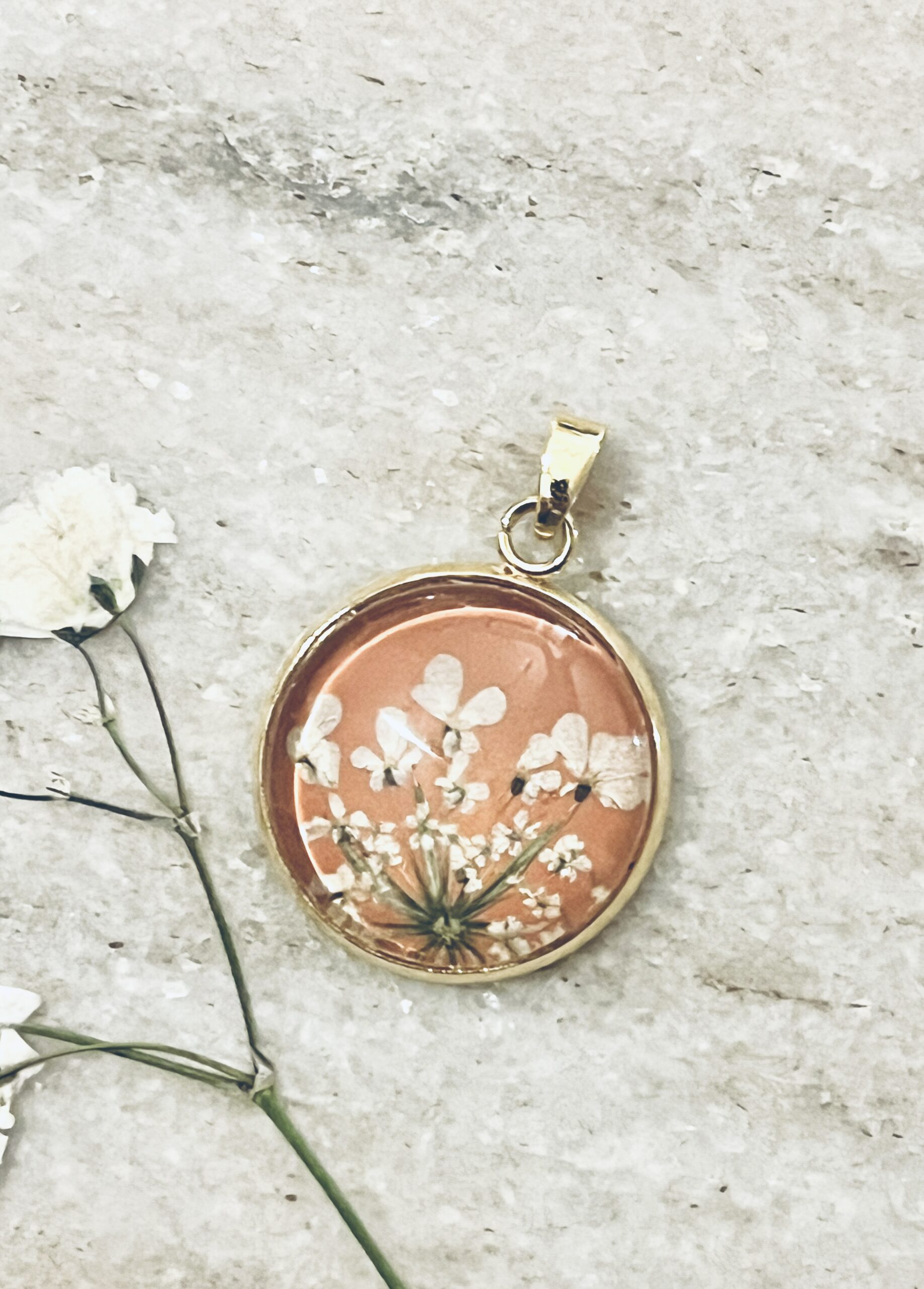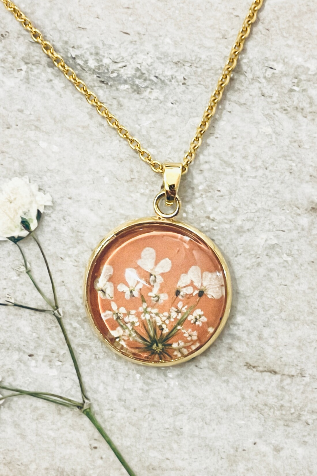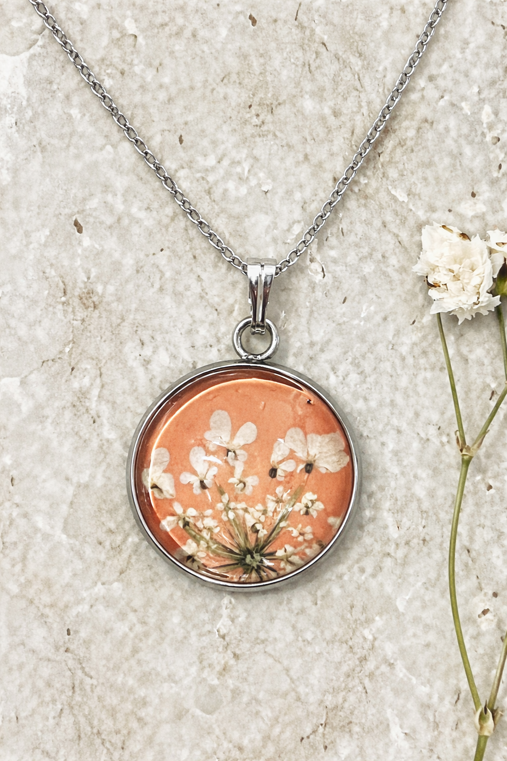 White Queen Anne’s Lace pressed blooms on a coral background