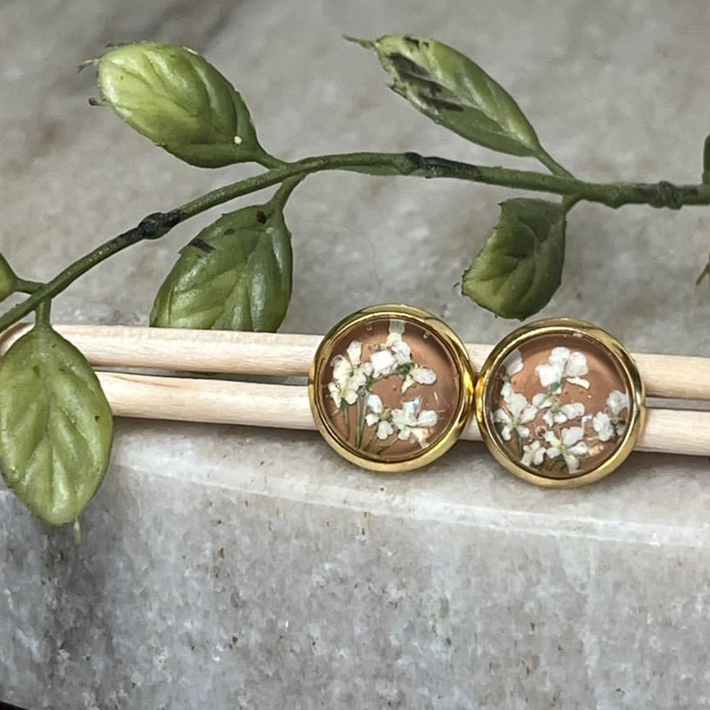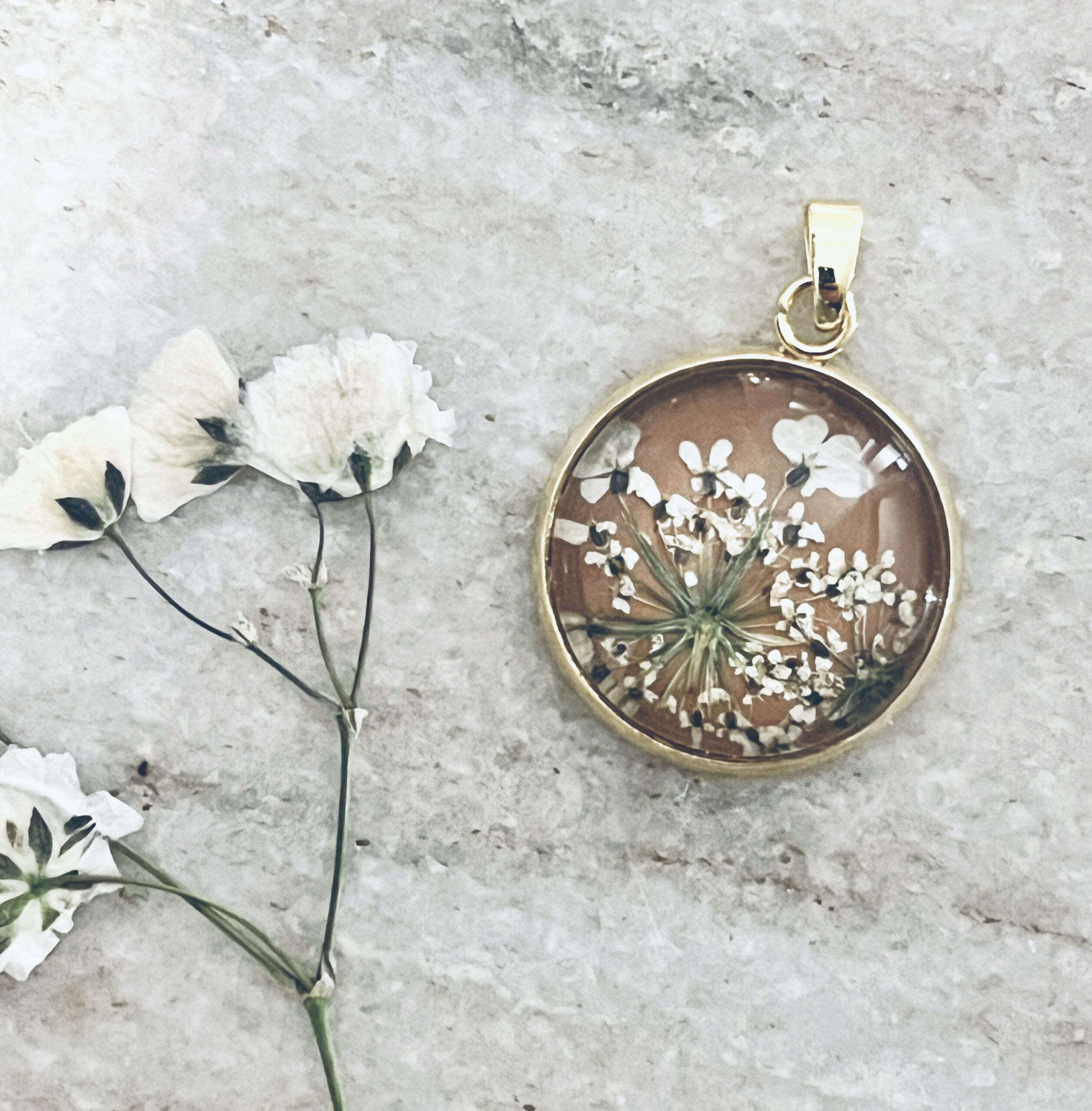 White Queen Anne’s Lace pressed blooms on a clay background